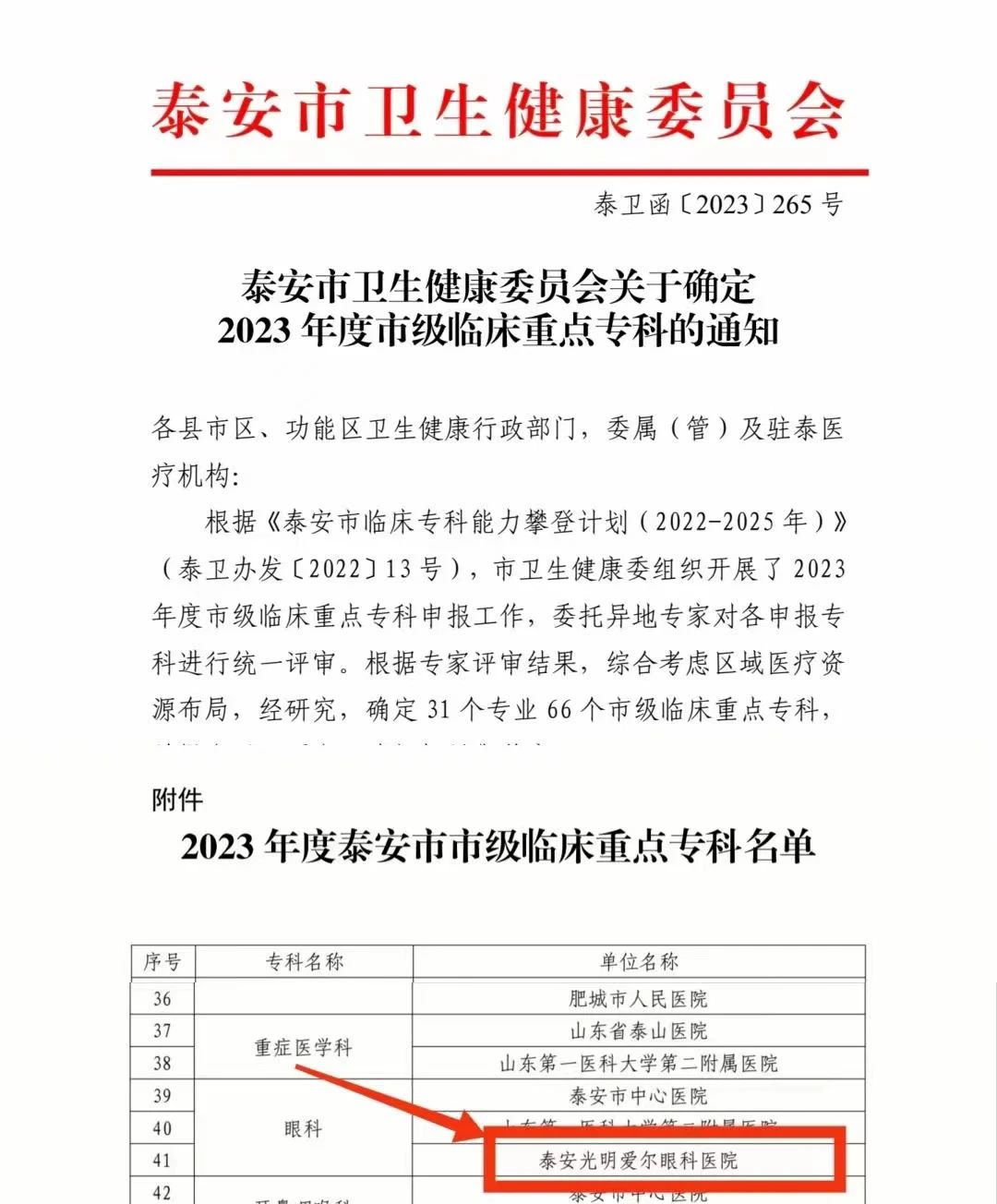 ?12月12日,泰安市衛(wèi)生健康委會下發(fā)了《關(guān)于確定2023年度市級臨床重點??频耐ㄖ?,公布了泰安市市級臨床重點??泼麊?,泰安光明愛爾眼科醫(yī)院憑借扎實的??乒Φ缀蛯I(yè)的技術(shù)水平被確定為2023年度泰安市市級臨床重點???。