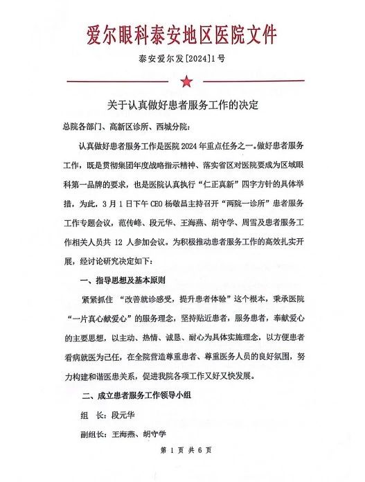 為進(jìn)一步鞏固提升醫(yī)院優(yōu)質(zhì)服務(wù)成果,持續(xù)深化“以患者為中心”的現(xiàn)代化醫(yī)院優(yōu)質(zhì)服務(wù)建設(shè),3月6日下午,愛(ài)爾眼科泰安地區(qū)召開(kāi)“篤志患者服務(wù) 提升綜合實(shí)力 推動(dòng)醫(yī)院高質(zhì)量發(fā)展”動(dòng)員大會(huì),泰安光明愛(ài)爾眼科醫(yī)院(總院)全體員工及泰安愛(ài)爾眼科醫(yī)院(分院)各科主任及員工代表、高新區(qū)診所全體員工參加會(huì)議。愛(ài)爾眼科泰安地區(qū)總院長(zhǎng)范傳峰主持會(huì)議。 01領(lǐng)導(dǎo)講話 行政副院長(zhǎng)、患者服務(wù)小組組長(zhǎng)段元華宣讀愛(ài)爾眼科泰安地區(qū)2024年1號(hào)文件《關(guān)于認(rèn)真做好患者服務(wù)工作的決定》,并對(duì)各部門(mén)具體實(shí)施方案進(jìn)行了部署。 行政副院長(zhǎng)段元華表示,“全面改善就診感受,提升患者體驗(yàn)”是我院綜合服務(wù)水平的根本,也是醫(yī)院高質(zhì)量發(fā)展的迫切需要。因此醫(yī)院秉承“一片真心獻(xiàn)愛(ài)心”的服務(wù)理念,成立“患者服務(wù)工作領(lǐng)導(dǎo)小組”,在全院范圍內(nèi)開(kāi)展以促進(jìn)“提升病人滿意度”為核心的指導(dǎo)、督導(dǎo)工作。 ?CEO楊敬昌做了題為《篤志患者服務(wù) 提升綜合實(shí)力?推動(dòng)醫(yī)院高質(zhì)量發(fā)展》的動(dòng)員講話,闡明了我院開(kāi)展好患者服務(wù)工作的重要意義,要求大家進(jìn)一步統(tǒng)一思想,提高認(rèn)識(shí),把工作重點(diǎn)統(tǒng)一到醫(yī)院的決策部署上來(lái),扎實(shí)開(kāi)展優(yōu)質(zhì)服務(wù)工作。 楊敬昌要求大家要大張旗鼓、轟轟烈烈地開(kāi)展好此項(xiàng)工作,要突出亮點(diǎn)特色,大力唱響“一片真心獻(xiàn)愛(ài)心”的服務(wù)口號(hào),把開(kāi)展好患者服務(wù)工作作為醫(yī)院黨建工作的重要內(nèi)容,將此項(xiàng)工作的貫徹落實(shí)提升到一個(gè)更高的政治水平,成立“共產(chǎn)黨員志愿者服務(wù)隊(duì)”,積極投身其中,發(fā)揮引領(lǐng)作用。 楊敬昌同時(shí)強(qiáng)調(diào),開(kāi)展好患者優(yōu)質(zhì)服務(wù)工作還須做到思路清晰、重點(diǎn)突出,要緊緊圍繞“人員素養(yǎng)、就診環(huán)境、核心服務(wù)流程”三大重點(diǎn)有序開(kāi)展,要以此項(xiàng)工作為契機(jī)和工作抓手,改善就診環(huán)境,著力提升員工素養(yǎng)水平,優(yōu)化核心服務(wù)流程,提升綜合實(shí)力,推進(jìn)醫(yī)院高質(zhì)量發(fā)展。 此次動(dòng)員部署大會(huì)的成功召開(kāi),不僅為醫(yī)院工作未來(lái)的發(fā)展指明了方向,也為全體醫(yī)護(hù)人員注入了新的動(dòng)力和信心。醫(yī)院?jiǎn)T工紛紛表示,未來(lái)將立足崗位、拓展思維、集思廣益,堅(jiān)持患者至上,為患者提供更高品質(zhì)、更有溫度的醫(yī)療服務(wù),提升廣大患者的就醫(yī)體驗(yàn),共同打造百姓人人稱(chēng)贊的專(zhuān)業(yè)眼科醫(yī)院!